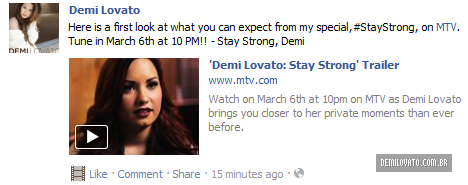 “Aqui está a primeira olhada no que você pode esperar do meu especial, #StayStrong, na MTV. Fique ligado no dia 6 de março às 10 da noite (horário local)!! – Stay Strong, Demi”