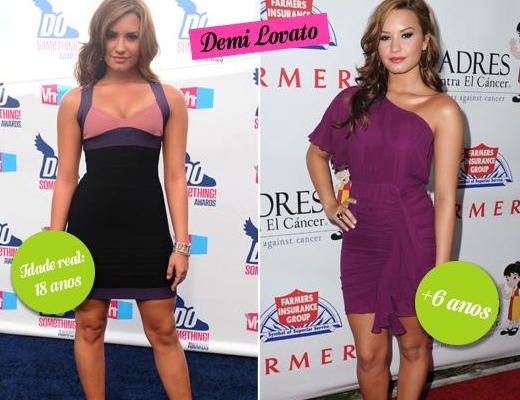Por quê mais velha? O modelo de ombro único é superatual, mas a cor e make mais fortes, combinados com os babados do vestido dão alguns anos a mais para a Demi.