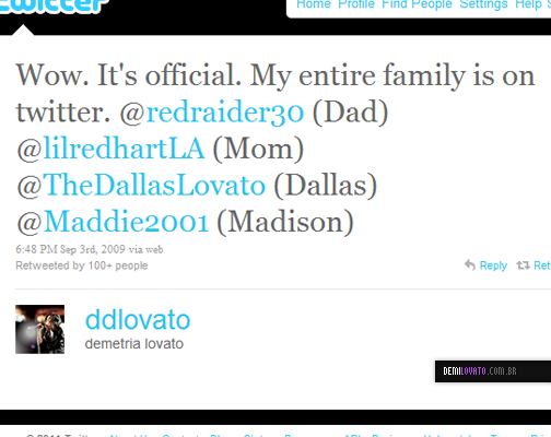 No tweet acima, Demi publicou que a sua família estava no twitter. @RedRaider30 (Pai, que na verdade é padastro) @lilredheartLA (Mãe) @TheDallasLovato (Dallas, sua irmã mais velha) e @Maddie2001 (Irmã mais nova, porém mudou seu twitter para @MaddieLovesYou1)