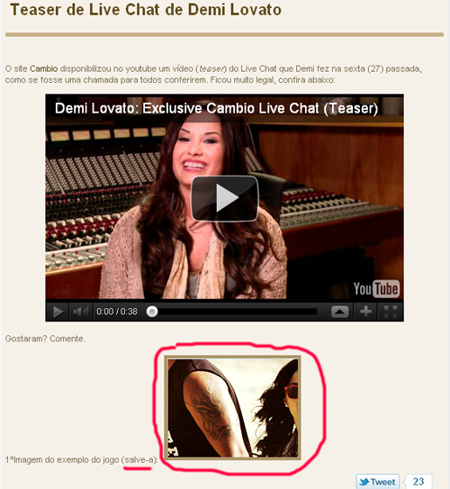 EXEMPLO PARA ENVIAR O SEU TWEET: “Jogo “Caça a imagem” no @demilovatobr – Fase: Exemplo. (link da imagem aqui)”