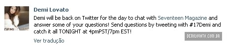“Demi vai estar de volta no Twitter por hoje para conversar com Seventeen Magazine e responder algumas de suas perguntas! Envie perguntas twittando com #17Demi e confira as respostas a noite ás 4pmPST/7pm EST!”