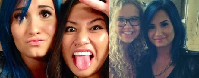 Demi, mentora do grupo “Girls” do The X Factor USA, marcou hoje (10) com as meninas – Ellona Santiago, Rion Paige e Khaya Cohen – uma reunião num lugar não divulgado. As participantes do reality show, depois do término da mesma, atualizaram suas redes sociais com fotos ao lado da cantora e seu novo look: cabelo curto e ainda mais azul. Confira abaixo: