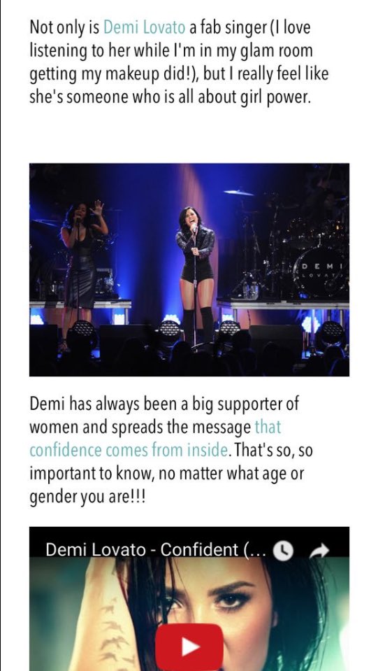 “Demi Lovato não é apenas uma cantora fabulosa (eu amo escutar as músicas dela enquanto estou fazendo a minha maquiagem), mas eu realmente sinto que ela é uma pessoa que é tudo sobre o poder feminino.