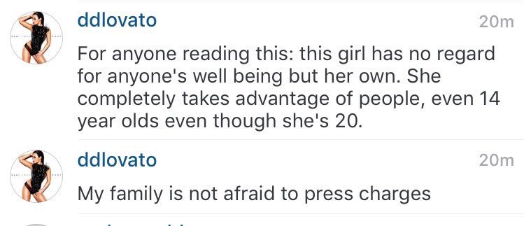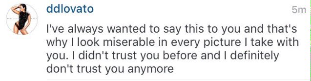 Demi: “Eu não sou sua “garota” porra nenhuma. Se eu fosse você eu não me pediria mais foto. Você persegue as pessoas para viver. Nós não somos amigas! Fique longe de mim e, mais importante, da minha família”.